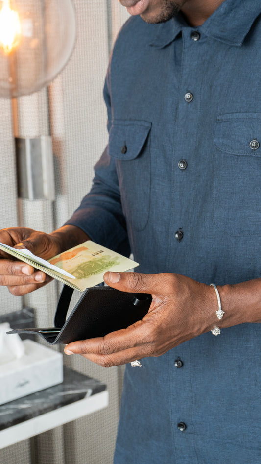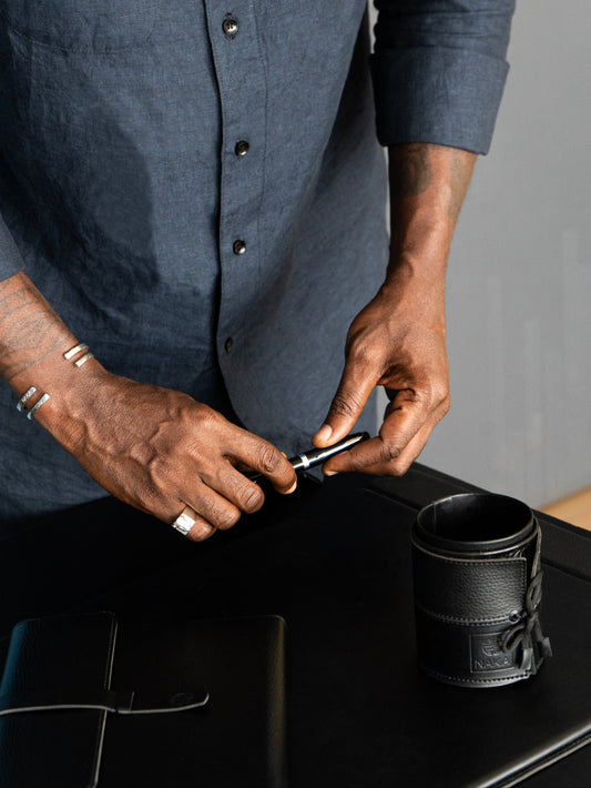 Découvrez notre collection de maroquinerie : sous-main, pot à stylo, bloc-notes et compagnon de voyage. Des pièces en cuir grainé, façonnées à la main avec soin à Abidjan, alliant élégance et savoir-faire artisanal.
